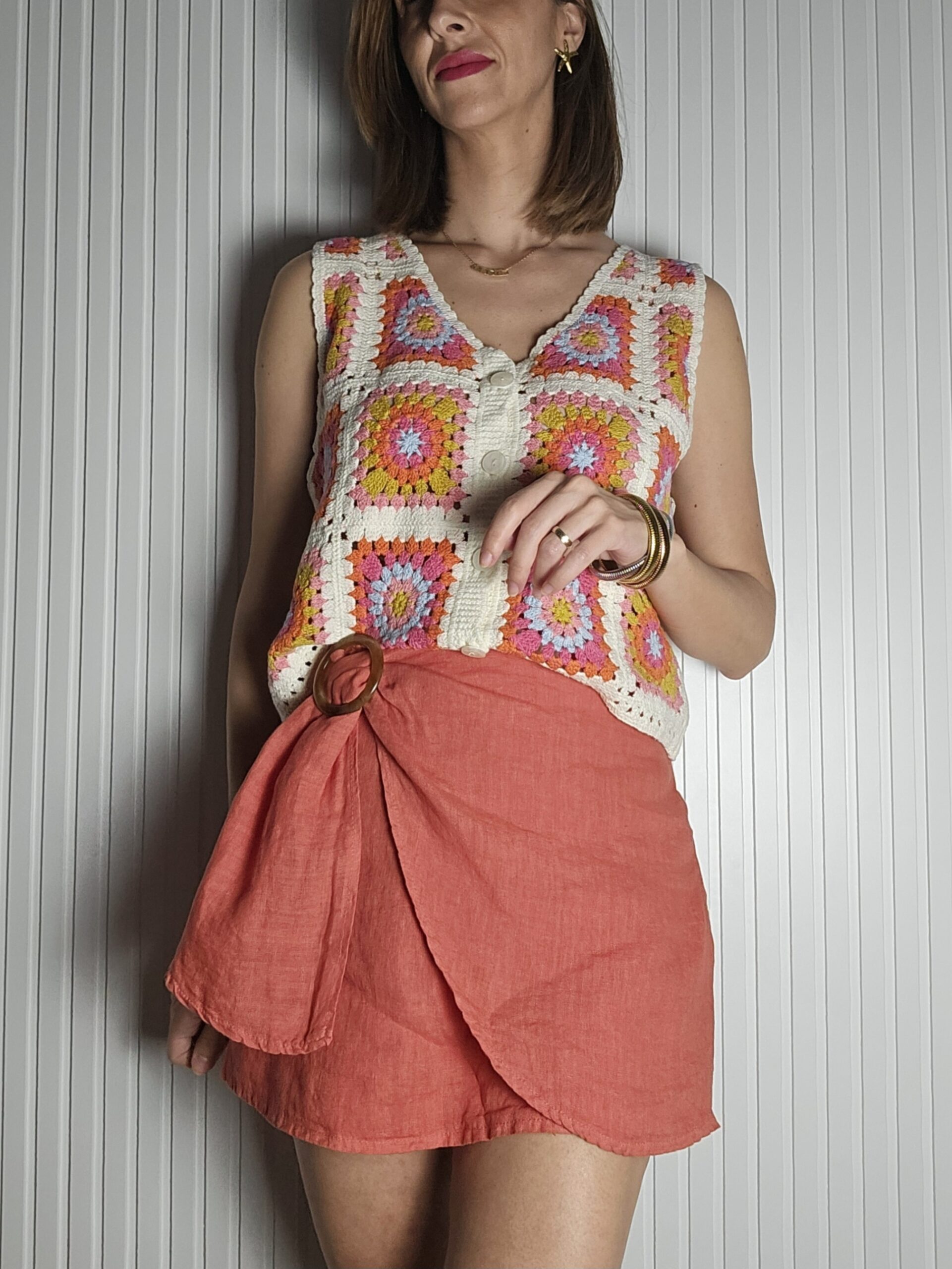 Falda Pantalón color coral, 100% lino, efecto pareo con hebilla nacarada,cierre mediante cremallera trasera,